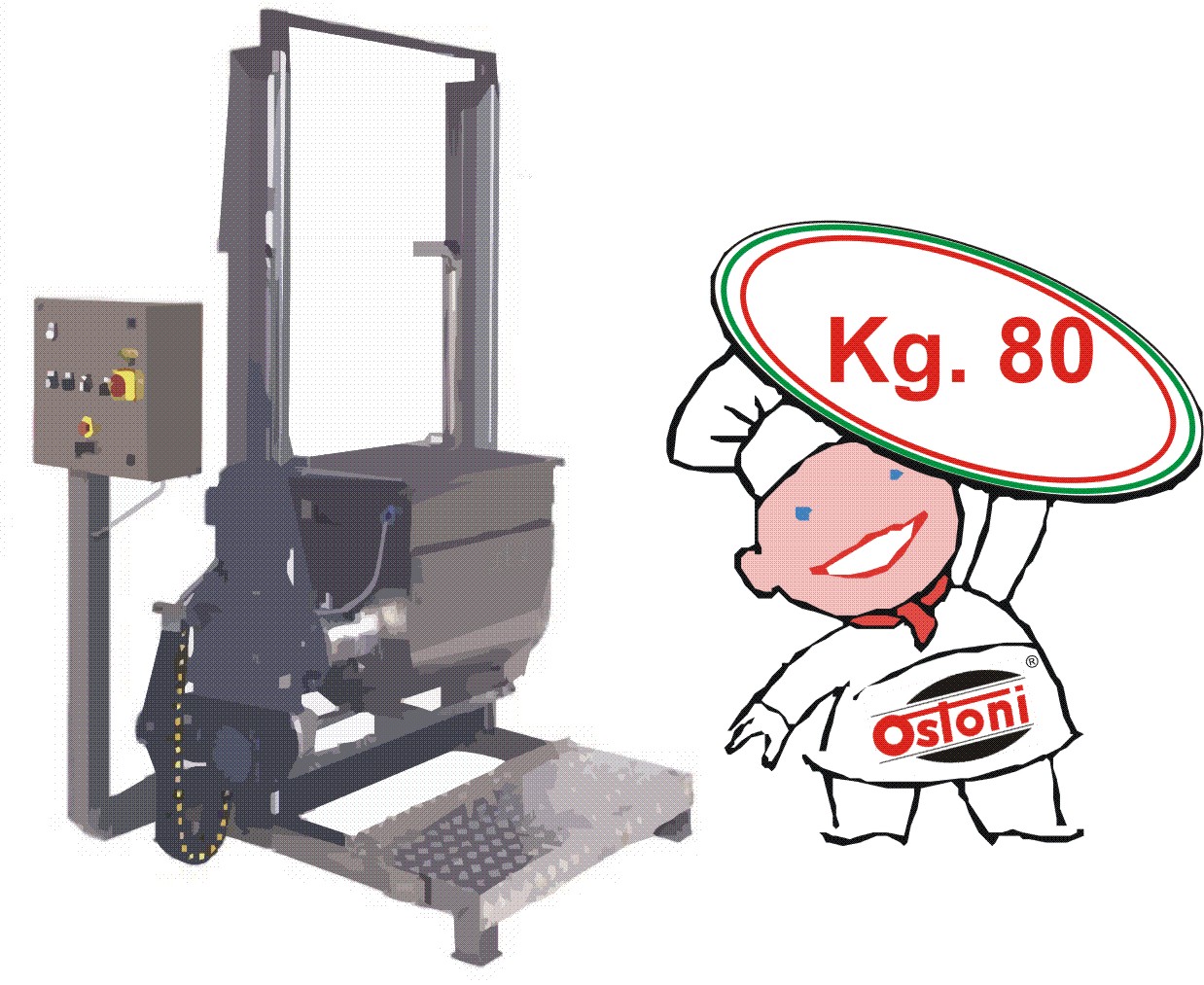 La vasca in acciaio inox ha una capacità di 80 Kg. di impasto; le pale, dotate di motorizzazione esterna e indipendente, sono sagomate ed adeguatamente inclinate per ottimizzare la distribuzione dell'impasto al suo interno.