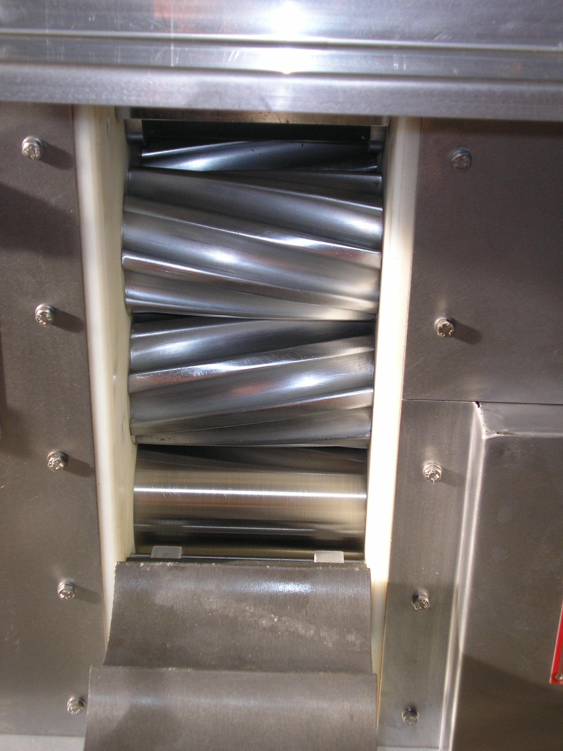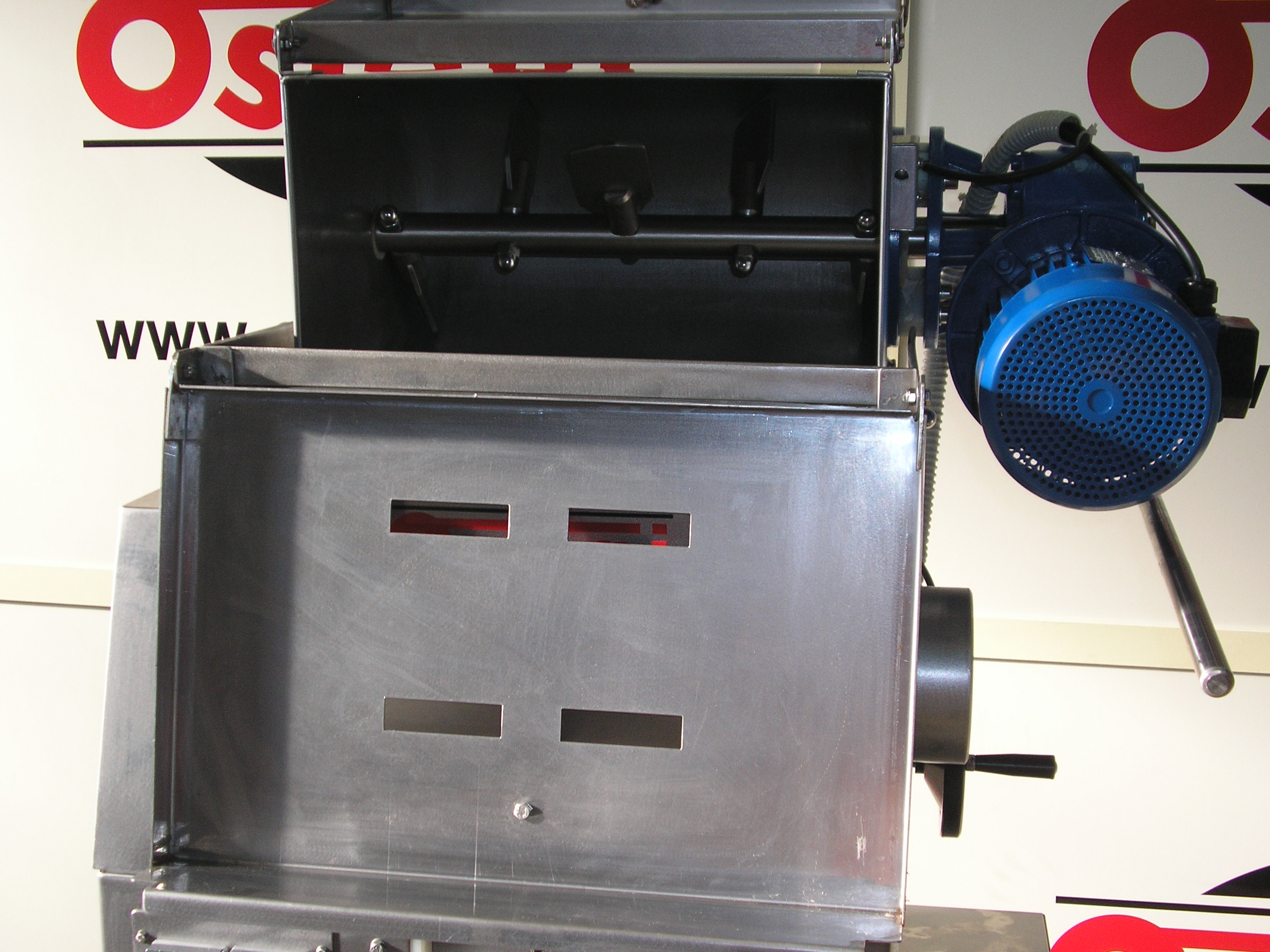 - vasca impastatrice posteriore ribaltabile, con albero e palette in acciaio inox.-tramoggia di carico in acciaio inox completa di motorizzazione per mescolare l'impasto fresco proveniente dall'impastatrice posteriore con eventuali ritagli di pasta